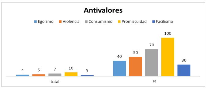 Con relación a la transmisión de valores o antivalores del reggaetón, los expertos consideraron que este género musical no trasmite ningún tipo de valor, como la solidaridad, el humanismo, el patriotismo, la humildad, la sinceridad, el respeto y el internacionalismo, sin embargo, expresaron que transmite antivalores sobresaliendo la promiscuidad donde los 10 expertos coincidieron para el 100% y el consumismo 7 de los expertos para un 70% (gráfico 4).