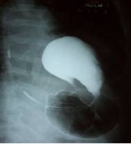 Además se observa hacia la parte superior del estómago el contorno de un asa, donde el aire hace función de contraste, en relación con el duodeno, por lo tanto estamos en presencia de una volvulación mixta. El paciente fue intervenido quirúrgicamente detectándose que la causa de la volvulación era una brida adherida al fundus gástrico que lo unía a asas yeyunales, con un mega estómago que presentaba hipotonía y adelgazamiento de la pared.